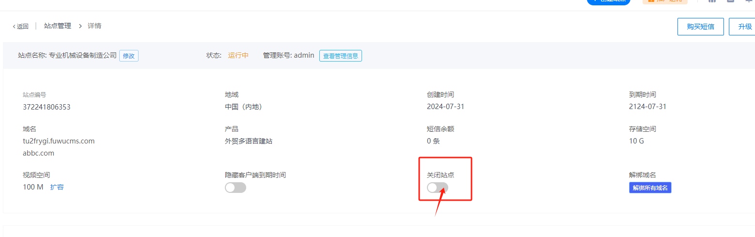 找到需要关闭的站点,点击右侧的详情按钮